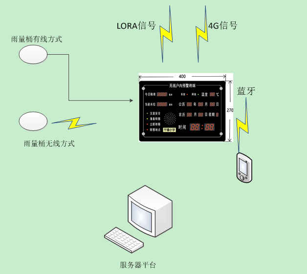本產(chǎn)品為入戶報警器家庭版,需要配合我司雨量桶使用,系統(tǒng)組成應用圖如下圖所示: