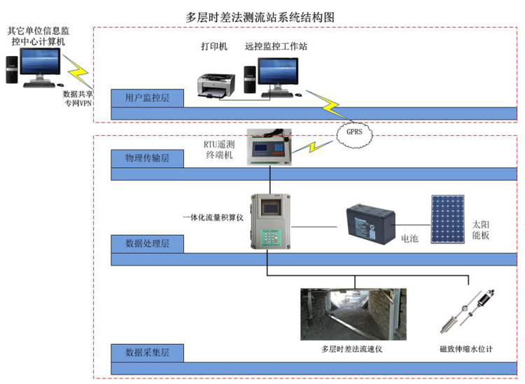 本測(cè)流設(shè)備主要有多層時(shí)差法流速儀、高精度水位計(jì)(磁致伸縮或磁編碼器浮子式等)一體化積算儀、傳輸模塊和供電單元組成。